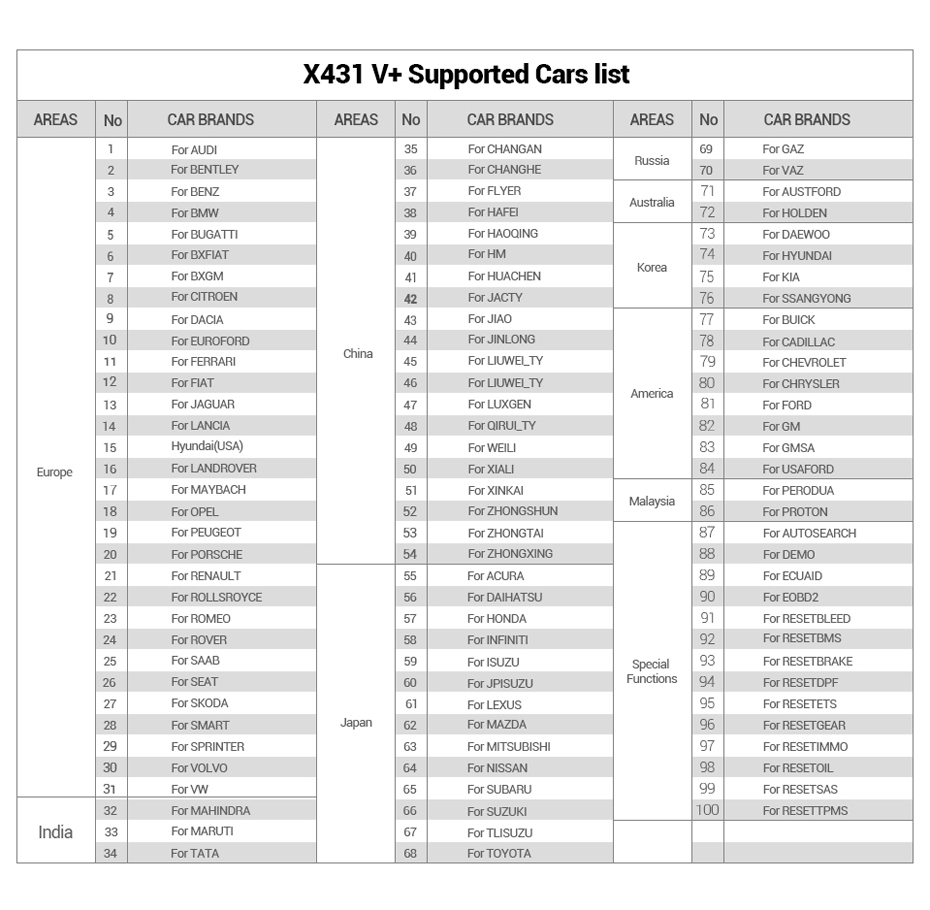 X431 V+ PRO3 Supported Vehicle List