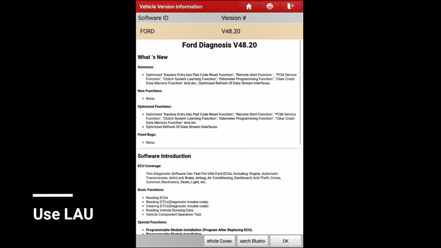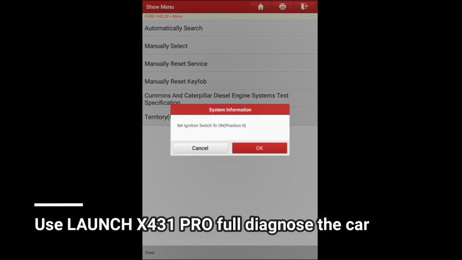Operation path: Local diagnose -> American -> Ford -> Vehicle version information (i.e Ford V48.20) -> Loading -> Automatically Search -> Set ignition Switch to ON (Position II) -> Vehicle specification -> Health Reports-> Trouble code found.