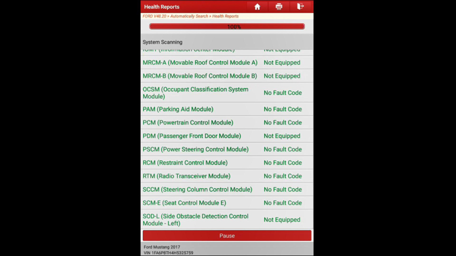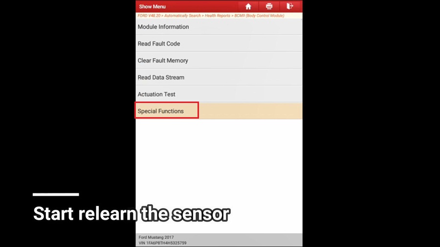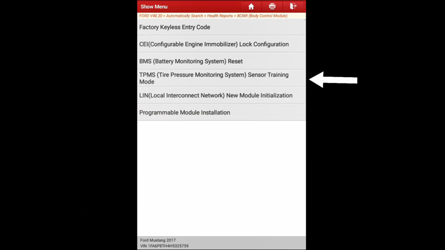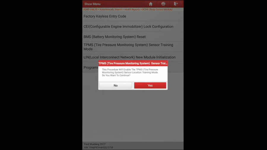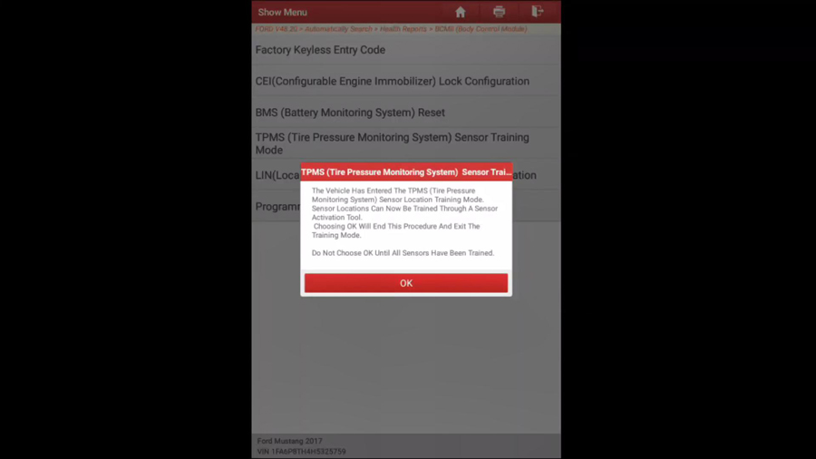 Back to X431 Pro Ford V48.20 ->Automatically search -> Health Reports -> BCM (Body Control Module), tap “Yes” to ensure all sensors have been trained.