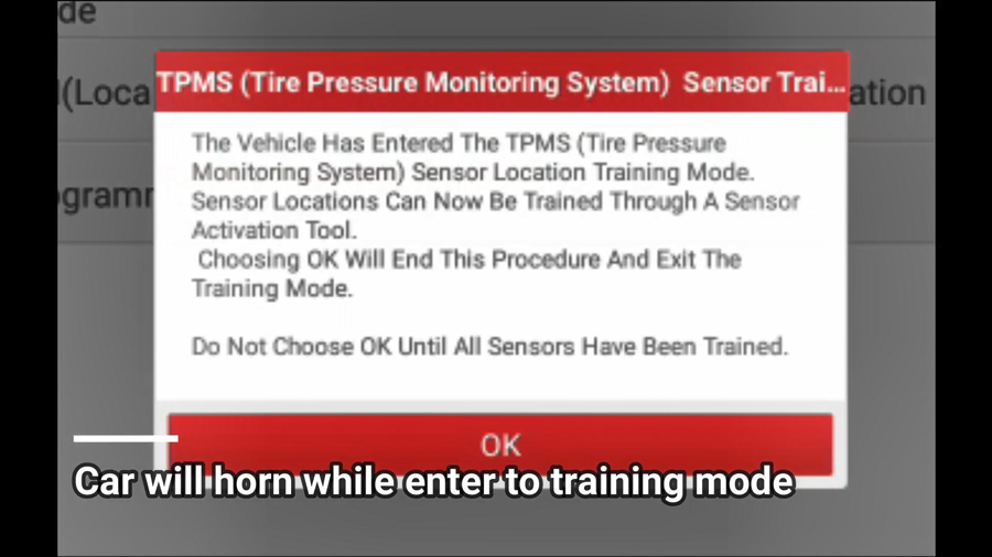 - This procedure will enable the TPMS (Tire Pressure Monitoring System ) Sensor location training mode. Do you want to continue? Select “Yes”.