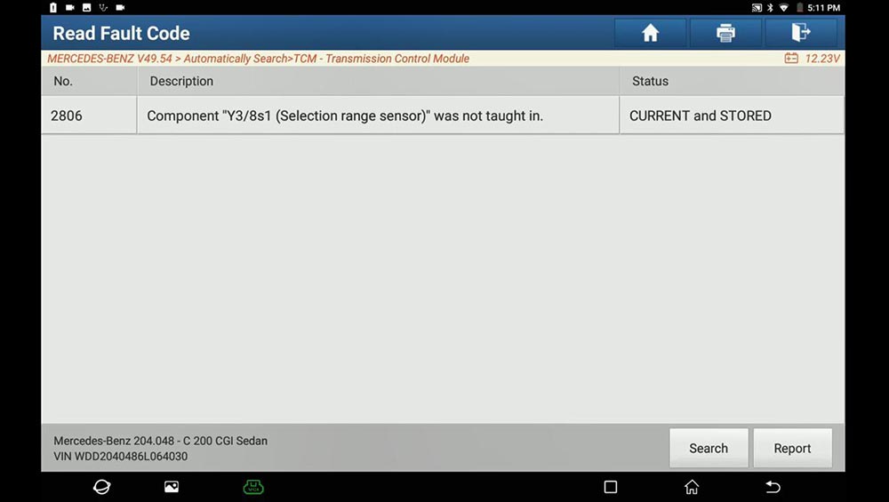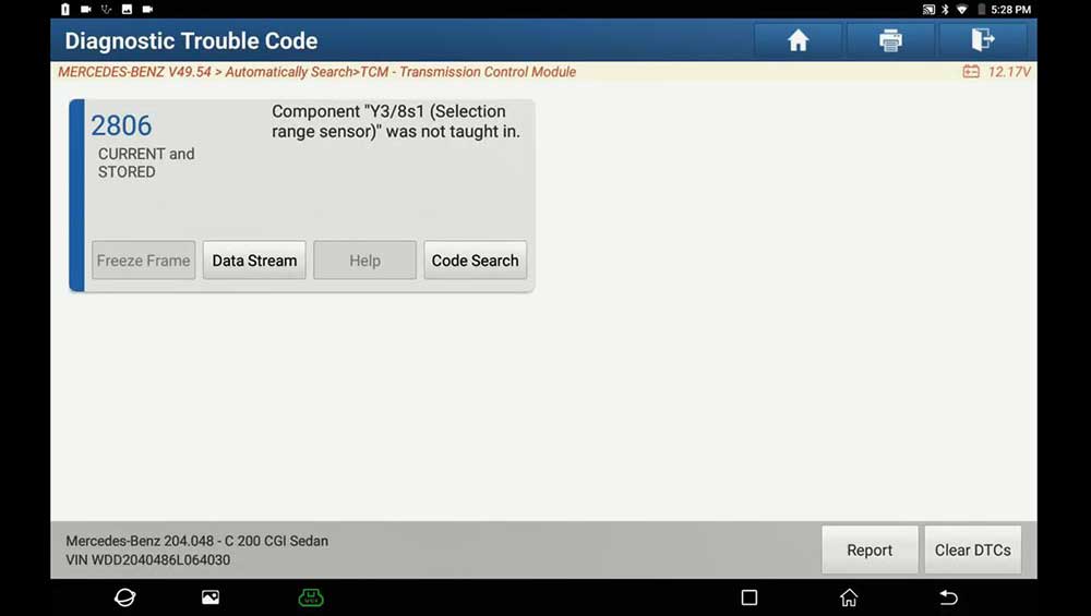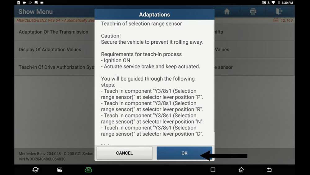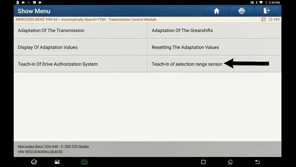 Path: full diagnose -> Mercedes Benz ->Automatically Search -> TCM -> Transmission Control Module -> Teach-in selection range sensor -> Teach-in Processes.