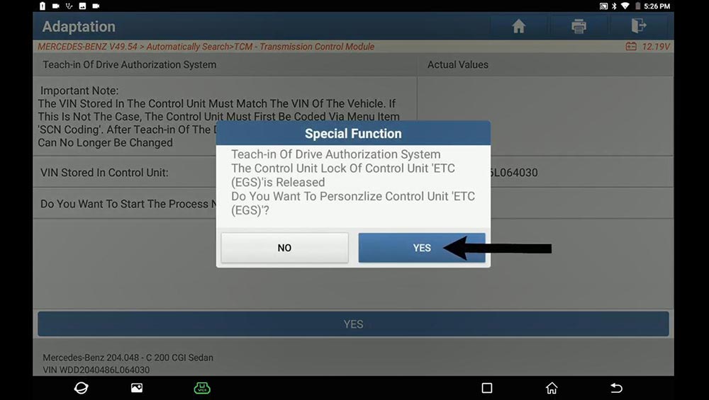 Click on “YES” to Personalize Control Unit “ETC (EGS)”.