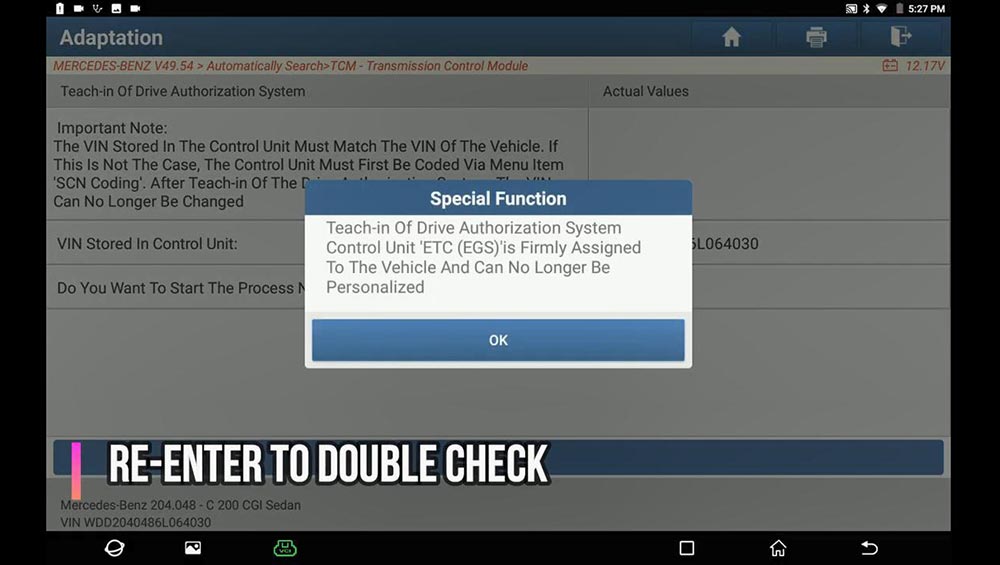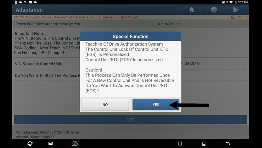 Teach-in of Drive Authorization System Control Unit ‘ETC (EGS)’ is firmly assigned to the vehicle and can No longer be personalized, click on “Yes”.