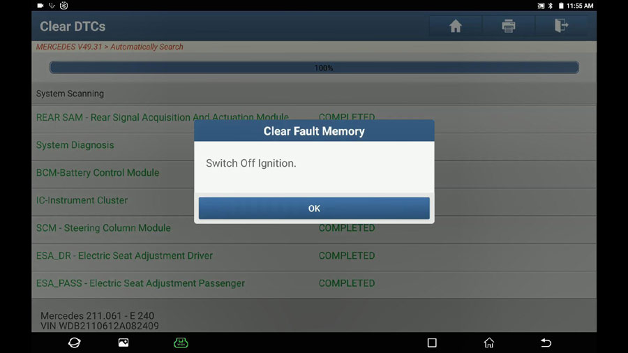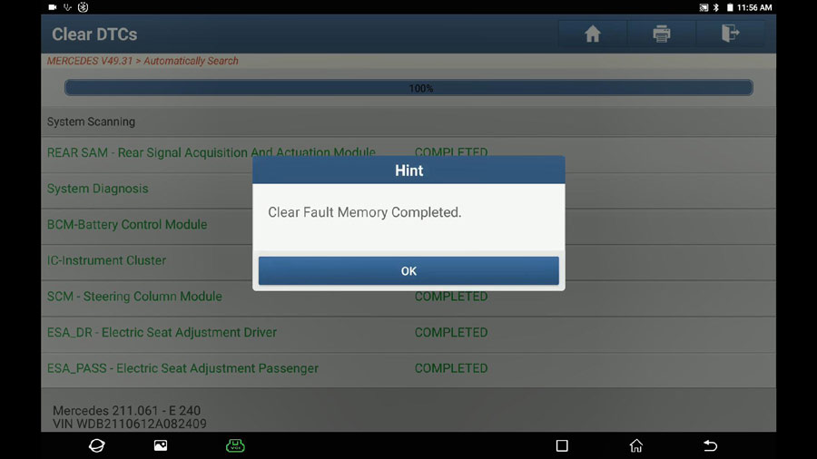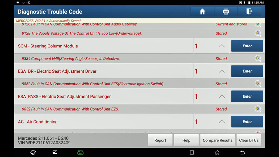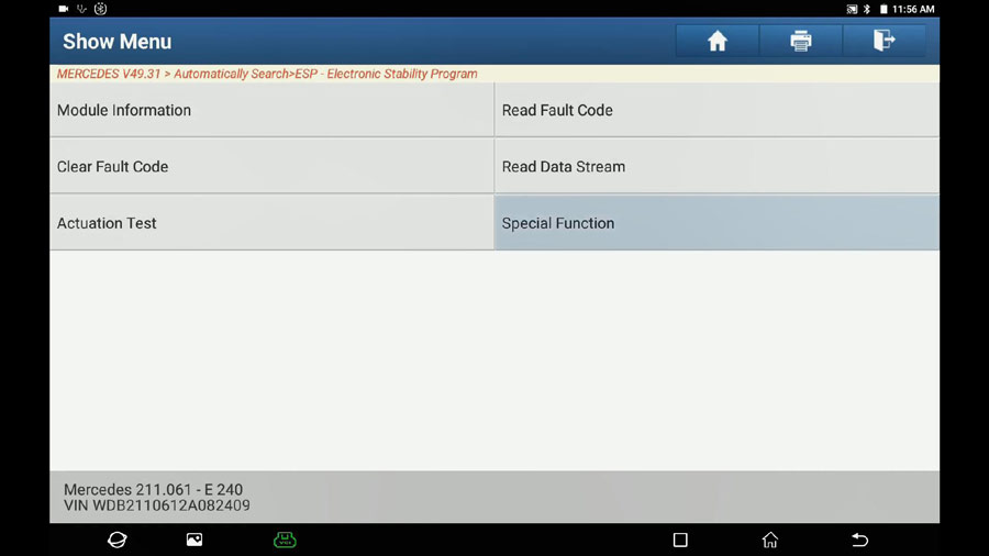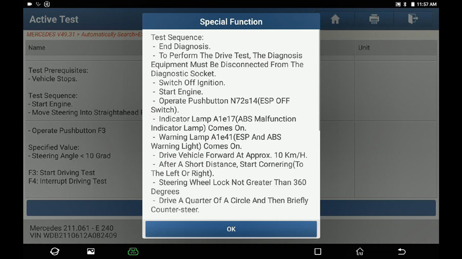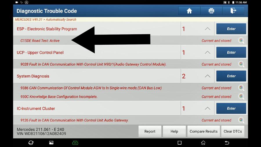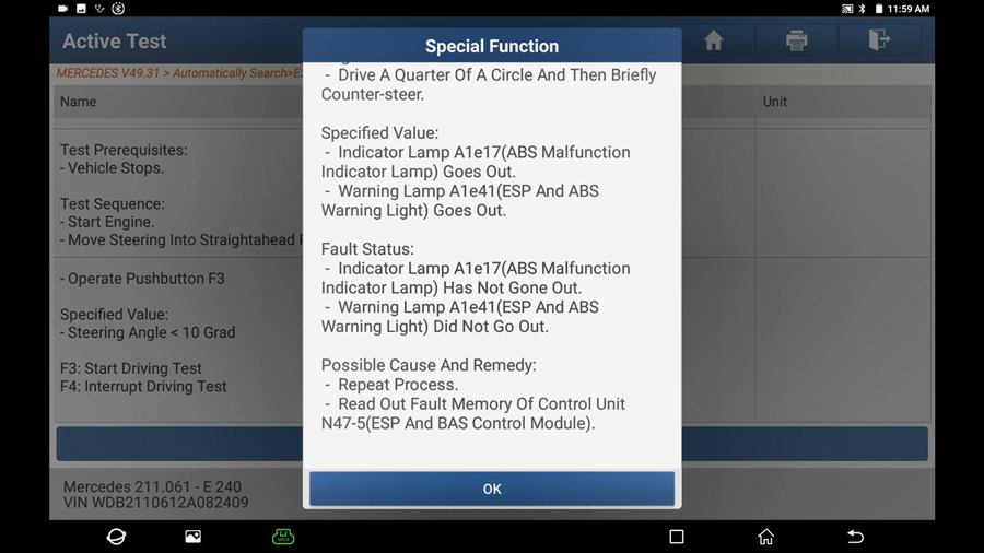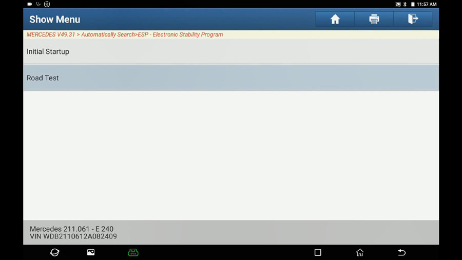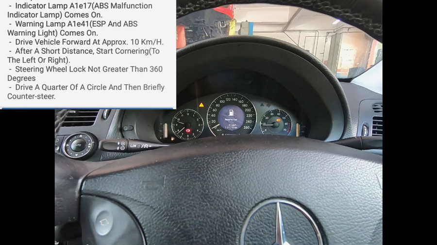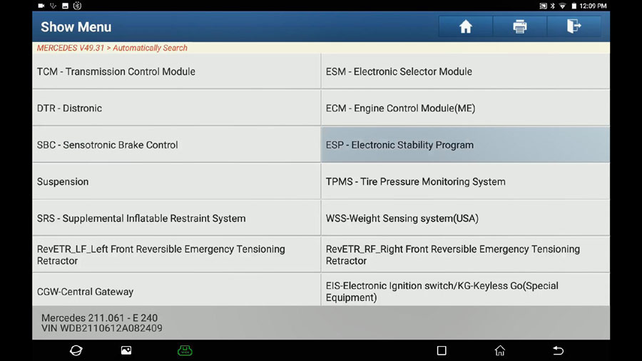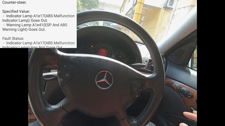 Repeat the path: Select Mercedes -> Automatically search -> 211-E Class (From 06/2005 to 05/2006) -> System selection -> ESP – Electronic Stability Program -> Switch on Ignition -> No fault.