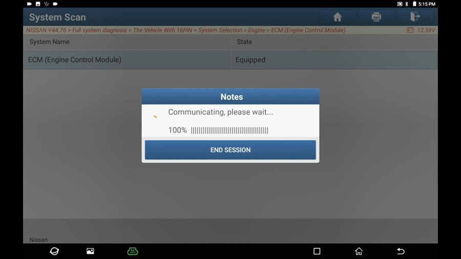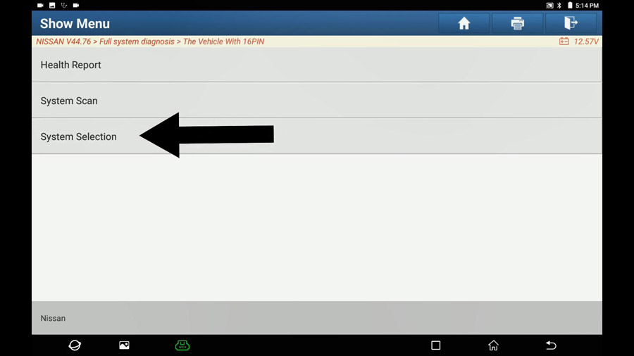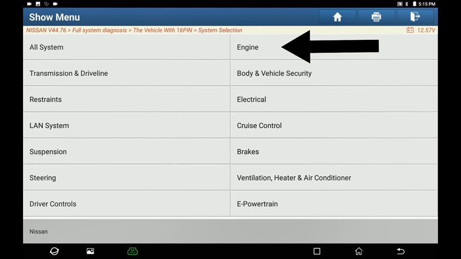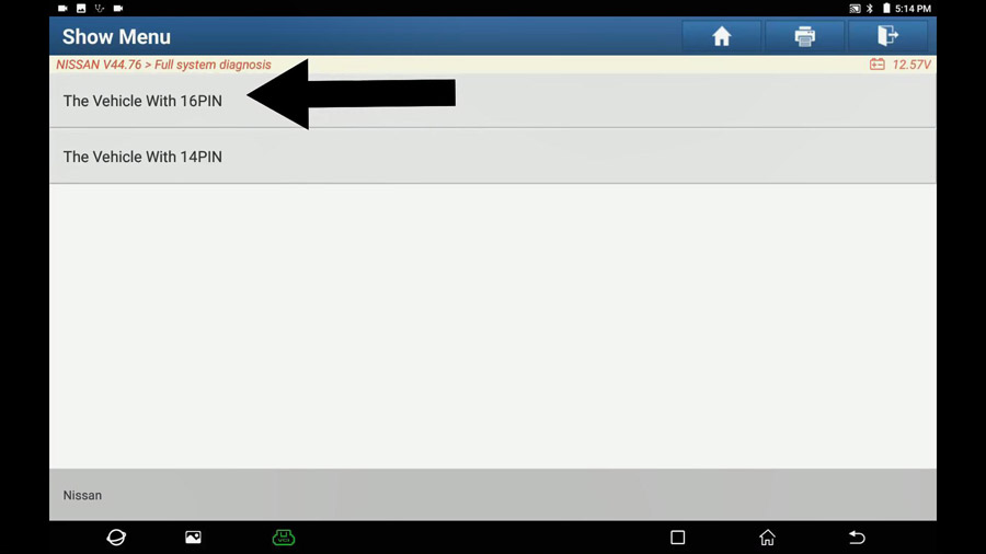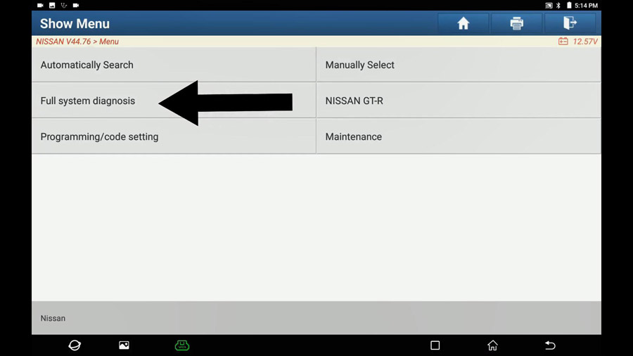 Hook X431 Pad V up to Nissan X-Trail T32 2017, select “Diagnosis” and then Nissan, then “Full system diagnosis”.
